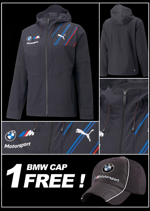 Veste homme BMW Motorsport by Puma Matière 86% polyester / 14% élasthanne - Couleur Gris anthracite Capuche réglable par cordon de serrage - 2 poches latérales zippées BMW 701219207-001