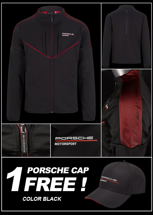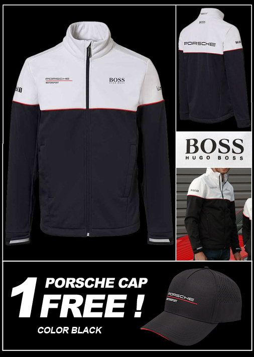 Veste homme Porsche Motorsport Hugo Boss Imperméable, confortable et respirante - Veste coupe-vent softshell coupe droite Couleur noir / blanc / détails rouge - Matière 100% polyester 2 grandes poches et 1 poche intérieure zippées Avec kit d'accessoires Porsche Motorsport Porsche WAP435LMS