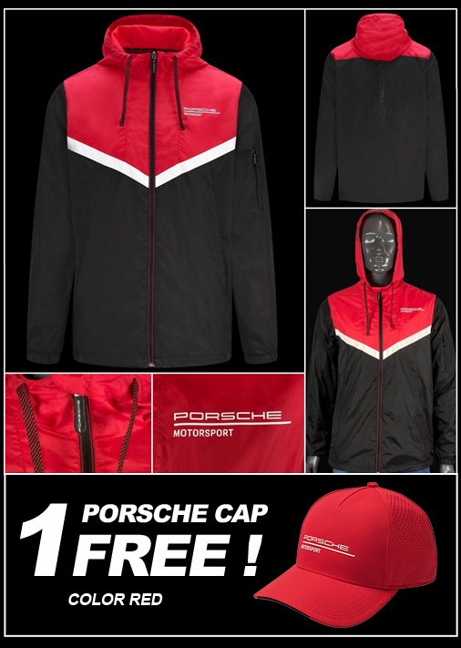 Veste à Capuche homme Porsche Motorsport Coupe vent et imperméable / effet déperlant - Matière 100% Polyester Capuche et possibilité de resserrer la veste au niveau de la ceinture 2 grandes poches latérales zippées - Couleur Noir / Rouge Fermeture par zip - Porsche WAP123NFMS