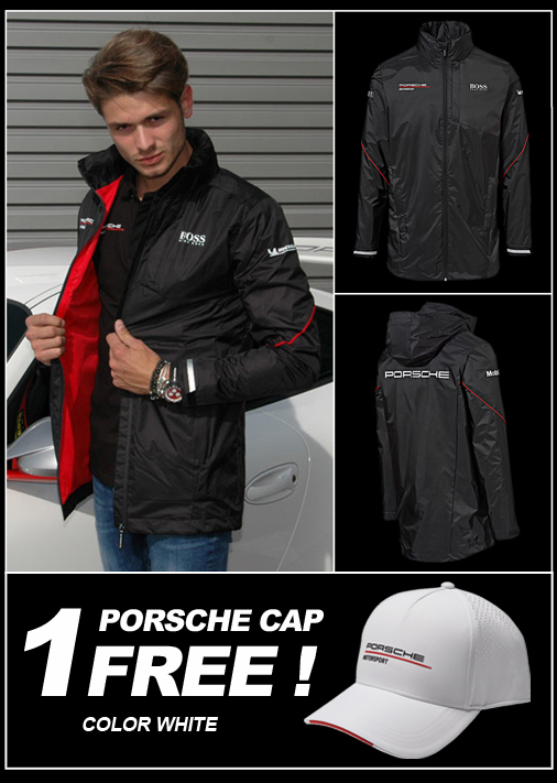 Veste mixte Porsche Motorsport Hugo Boss Couleur noir / détails rouge / blanc - Matière 100% polyamide Capuche repliable dans le col - Col droit et fermeture par zip 2 grandes poches côté et 1 poche poitrine zippées Avec kit d'accessoires Porsche Motorsport Porsche WAP438LMS