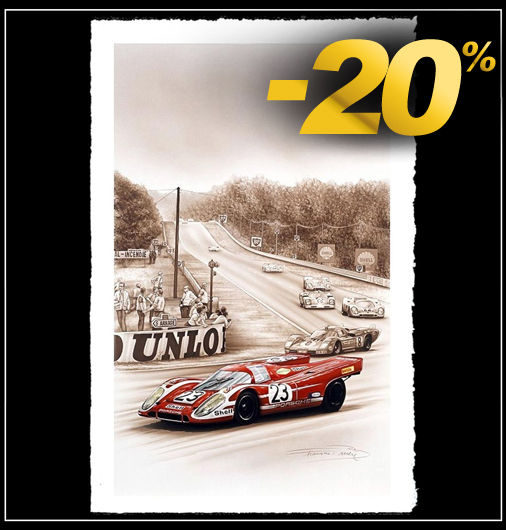 Reproduction d'un dessin original de François Bruère Porsche 917 K - Vainqueur 24h Le Mans 1970 60 x 76 cm - Papier Velin d'Arches 250 g/m2 Limitée à 200 exemplaires numérotés et signés