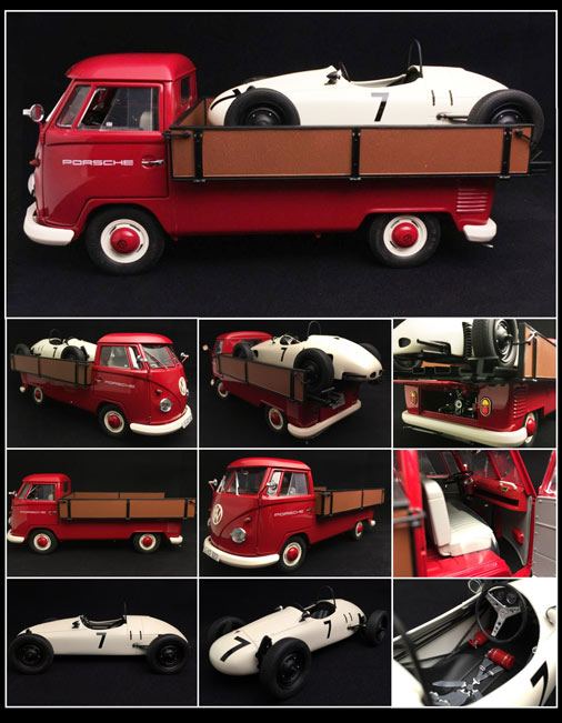 Duo Transporteur VW T1 & Formule V n°7 Rouge / Blanc 1/18 - Schuco 450037100 Portes ouvrantes - Intérieur très détaillé : la clé est sur le contact ! Roues orientables Compartiment moteur ouvrant très détaillé Edition limitée - 1500 exemplaires 299,95 € TTC / Incl. Taxes