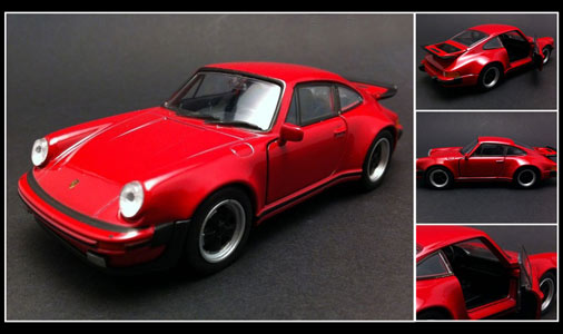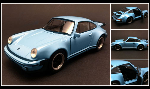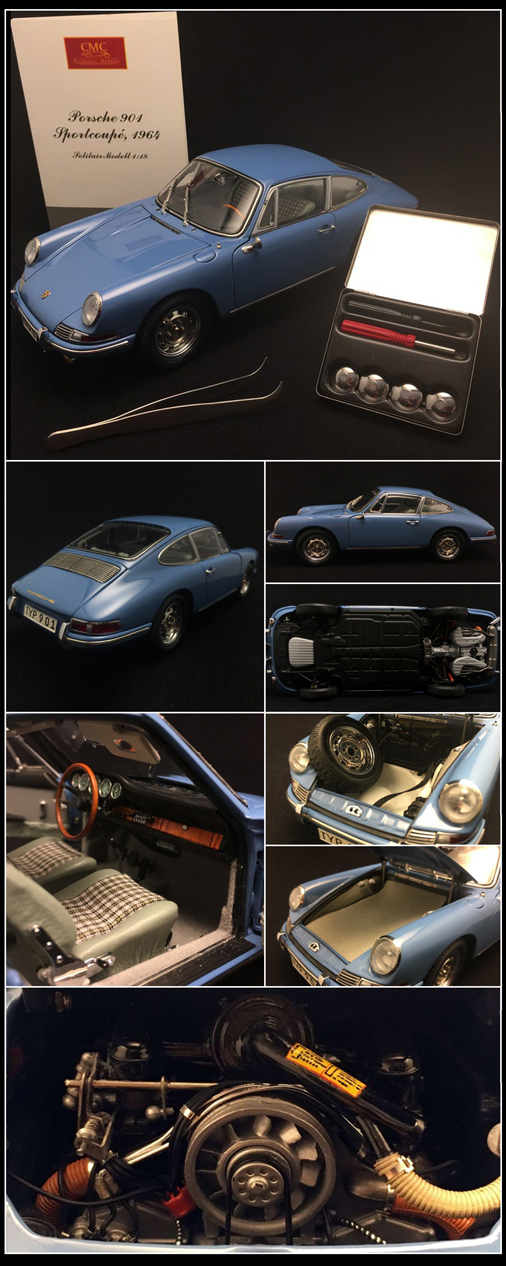 The model is emblematic : the first 911, and the reproduction is more than perfect : Hand-assembled model composed of almost 1000 pieces, all opening metal model with extremely detailed engine and chassis, no pipe or strap are missing, mobile real leather seats, retractable antenna, opening fuel trap with small leather protection, removable front trunk carpet with spare wheel inside, removable magnetic hub cabs. You can even use a special tool to unscrew the 5 wheel-rims nuts and change a wheel. This model will leave you speechless.