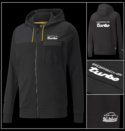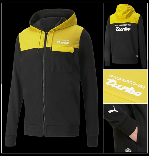 Hoodie homme Porsche Turbo by Puma Sweatshirt à capuche - 1 poche sur la poitrine - Bords côtes élastiqués - Fermeture par zip Couleurs : Noir / Jaune - Matière : 68 % Coton / 32 % Polyester Puma 533774-01 99,95 € TTC / Incl. Taxes