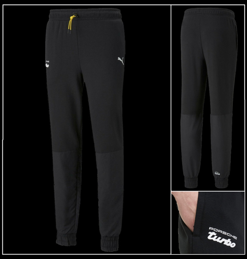 Pantalon homme Porsche Turbo by Puma Taille et chevilles élastiquées - 2 poches zippées Couleur Noir / Jaune - Matière 77% coton / 23% polyester Puma 533780-01 79,95 € TTC / Incl. Taxes