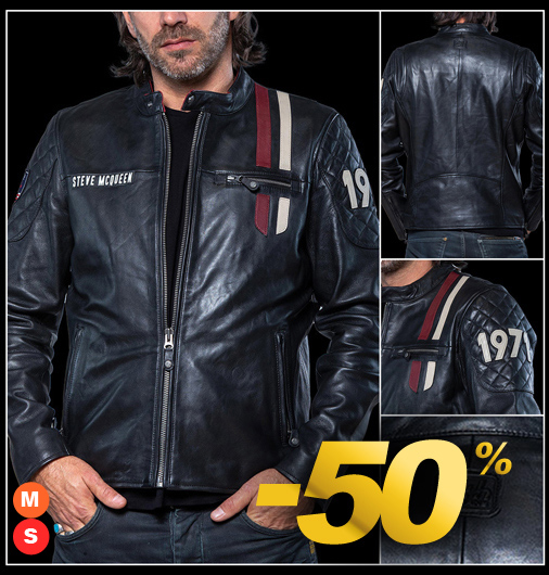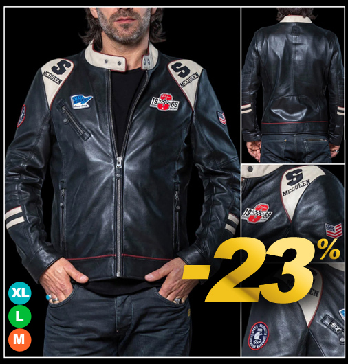 Veste en Cuir homme Steve McQueen - Tailles M / L / XL seulement Matière 100% cuir - Doublure 100% Coton - Couleur Noir - Col droit Fermeture zippée - 3 Poches zippées - 2 poches intérieures Classic Legend Motors 27493-3046