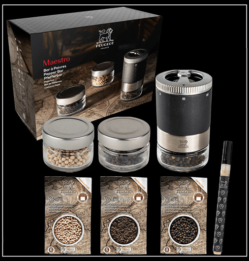 Coffret Bar à Poivres Peugeot Moulin à poivre u'Select Maestro 11 cm - 3 réservoirs en verre interchangeables 6 tailles de moutures prédéfinies - 3 poivres premiums en sachets fraicheur hermétiques Poivre Noir Kampot 20g - Poivre Blanc Sikara 20g - Poivre Sauvage Voatsiperifery 20g 1 feutre effaçable pour identifier facilement le contenu de chaque réservoir 84,95 € TTC / Incl. Taxes