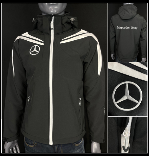 Veste homme Mercedes Softshell Capuche avec cordon entièrement amovible - 2 poches devant 1 poche sur la manche - Couleur: noir / blanc Matière: 92% polyester / 8% elasthane Mercedes SG7640M