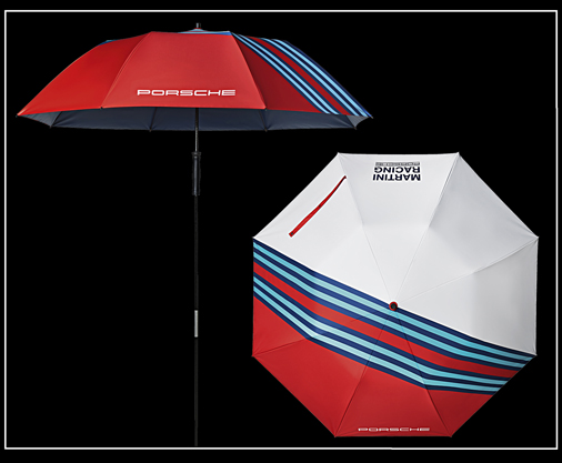 Parapluie / Parasol Porsche Martini Racing XL Se transforme en parasol grâce à un mat supplémentaire - Diamètre 120 cm Couleur blanc / Rouge / bleu - Matière 100% Polyester Porsche WAP0500820MSMR 89,95 € TTC / Incl. Taxes