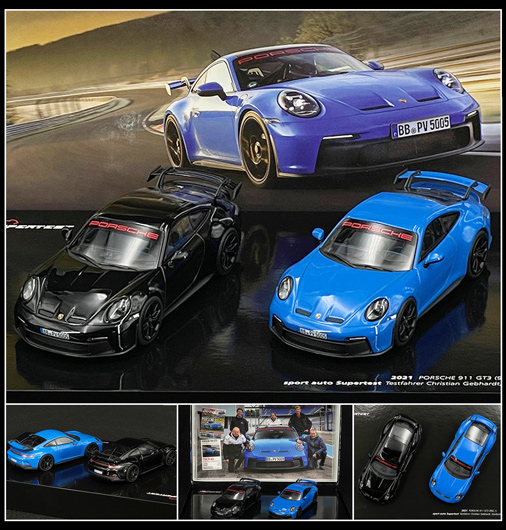 Set de 2 Porsche 911 GT3 2021 - Sport Auto Supertest Edition Bleu Requin / Noir 1/43 - Minichamps 412069200 Edition Limitée - 525 exemplaires numérotés