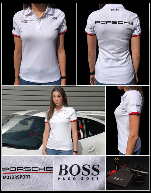 Polo femme Porsche Motorsport Hugo Boss Couleur blanc / détails rouge / noir - Matière 95 % coton / 5 % elasthane Tissu technique élastique confortable et respirant Poche poitrine avec fermeture par zip Avec kit d'accessoires Porsche Motorsport Porsche Design WAP432LMS 79,95 € TTC / Incl. Taxes
