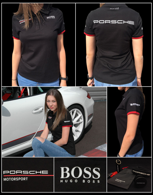 Polo femme Porsche Motorsport Hugo Boss Couleur noir / détails rouge / blanc - Matière 95 % coton / 5 % elasthane Tissu technique élastique confortable et respirant Poche poitrine avec fermeture par zip Avec kit d'accessoires Porsche Motorsport Porsche Design WAP434LMS 79,95 € TTC / Incl. Taxes