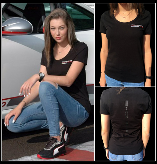 T-shirt femme Porsche Motorsport Couleur noir / détails rouge / blanc - Matière 95 % coton / 5 % elasthane Col échancré - Tissu élastique confortable et respirant Porsche Design WAP812LFMS 39,95 € TTC / Incl. Taxes