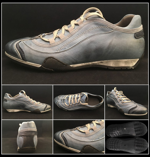 Chaussures pour homme Sport Sneaker Matière 100% cuir / semelle caoutchouc Semelle avec dessin Racing et talon arrondi Doublure et renforts cuir - Couleur bleu aspect vieilli Livré avec 2 paires de lacets : bleu et gris - Made in Italy