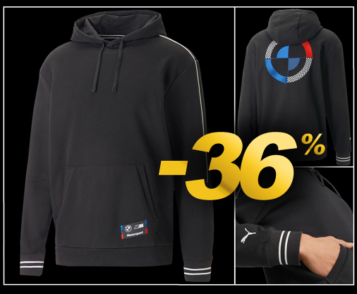 Hoodie homme BMW Motorsport by Puma Capuche réglable par cordon de serrage - Couleur Noir - Poche kangourou Taille et poignets côtelés - Matière 68% coton / 32% polyester Puma 538112-01