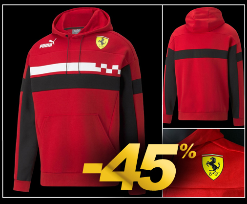 Hoodie homme Ferrari - Tailles M / XXL seulement Matière 77% Coton / 23% Polyester - Capuche avec cordons de serrage Couleur Rouge - Poche kangourou Puma 531650_02