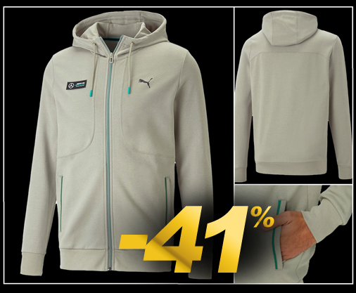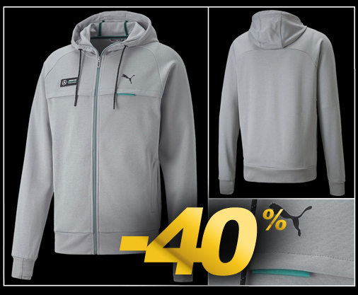 Hoodie homme Mercedes-AMG F1 - Tailles S / M / L seulement Fermeture par zip - Capuche réglable - 2 poches latérales Matière 60% Coton / 40% Polyester - Couleur Gris Puma 534906-02