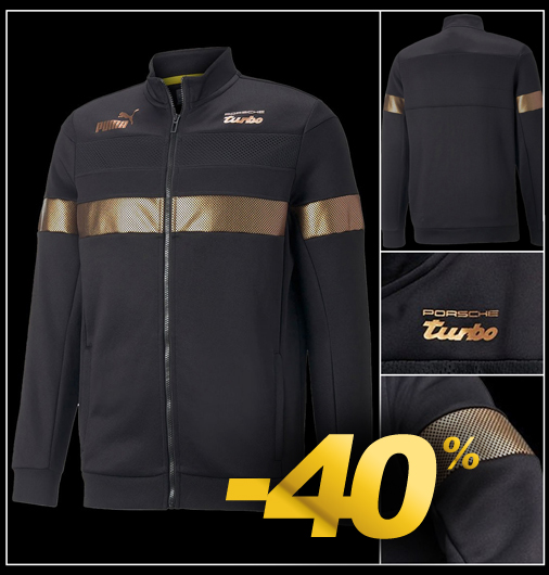 Veste homme Porsche Turbo - Tailles XS / S seulement Fermeture par Zip - Couleur noir / or - Matière 66% Polyester / 34% Coton Col droit / Poignets et taille côtelés - Poches latérales Puma 536423-001