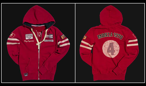 Veste Hoodie femme - Clay Regazzoni n°4 Matière : 100% coton Couleurs : rouge Ecussons brodés et inscriptions vintage sur les manches, dos et poitrine Bandes blanche sur les manches Signature Clay Regazzoni sur la poitrine Capuche doublée, fermeture par lacet large