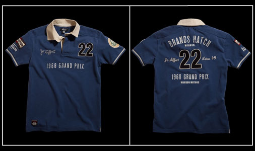 Polo homme - Jo Siffert Brands Hatch n° 22 Effet matelassé sur les épaules et bandes rouge et jaune sur les manches Signature Jo Siffert sur la poitrine Couleur: bleu 100% Coton