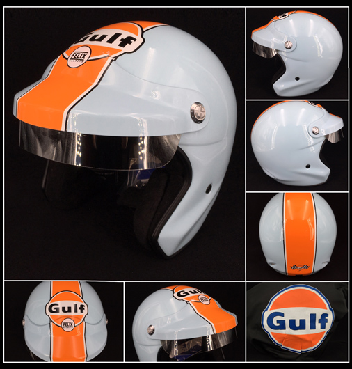 Casque Gulf Le Mans Couleur bleu Gulf / orange - Matière Coque Fibre de verre Habillage intérieur éponge bouclette - Visière démontable avec pare-soleil fixe 2 aérations à l'arrière - Casque homologué E22-05 249 € TTC / Incl. Taxes
