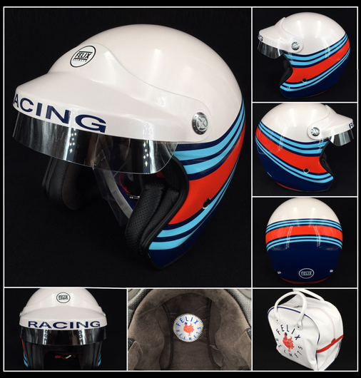 Casque Racing Couleur blanc métallisé / bleu / rouge - Matière Coque Fibre de verre Habillage intérieur cuir synthétique - Visière démontable avec pare-soleil fixe Sac de transport simili cuir blanc, intérieur doublé en coton 2 aérations à l'arrière - Casque homologué E22-05 219 € TTC / Incl. Taxes