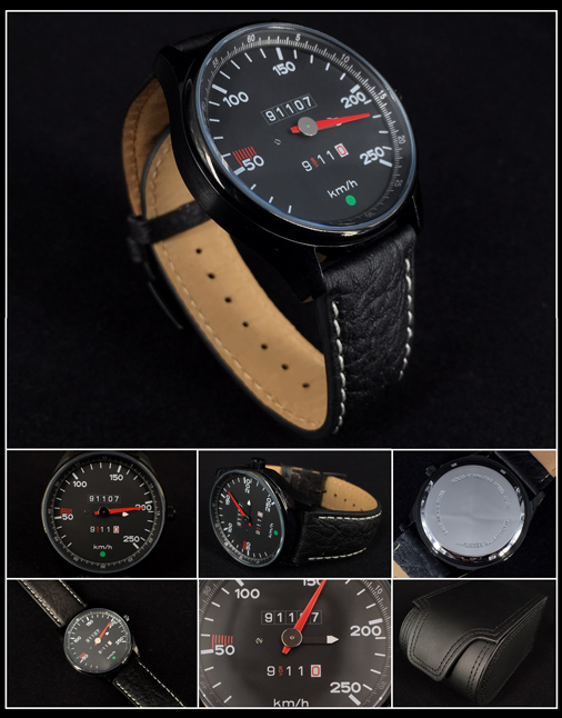 Montre compteur de vitesse Porsche 911 250 km/h Mouvement quartz Miyota Japan - Bracelet cuir noir / surpiqures blanches Boitier en acier inoxydable noir - Boucle en acier - Verre plat Fond vissé - Diamètre 41 mm - Epaisseur 10 mm - Bracelet 22 mm Etanche 10 ATM / 100m - Livré dans sa boite de présentation en cuir Made in Germany 159,95 € TTC / Incl. Taxes