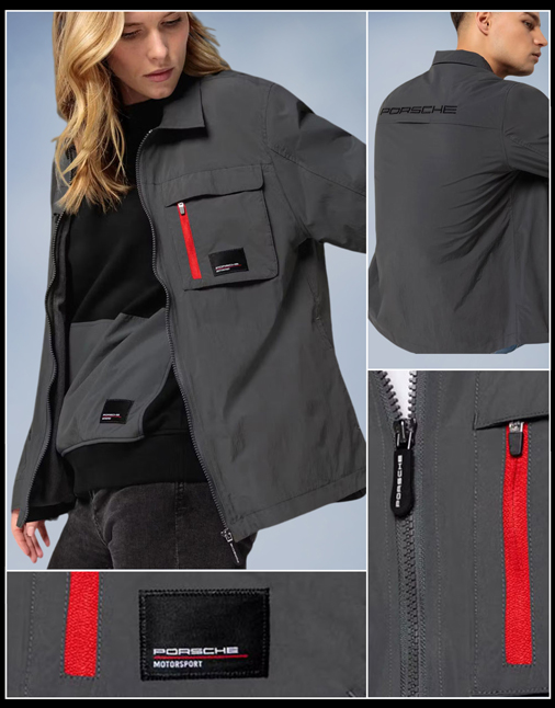 Veste mixte Porsche Motorsport Matière 100% Nylon - Fermeture principale zippée - Couleur Gris - 2 poches latérales 2 poches poitrine à soufflet - Fente de ventilation dans le dos Porsche WAP160RMSF 129,95 € TTC / Incl. Taxes