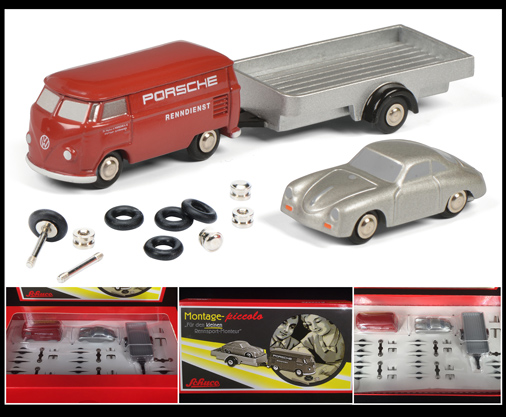 Transporteur Porsche VW T1 Combi Avec Porsche 356 et remorque Kit à monter - Rouge / gris 1/87 - Schuco 450557900 Edition limitée - 1000 exemplaires 29,95 € TTC / Incl. Taxes