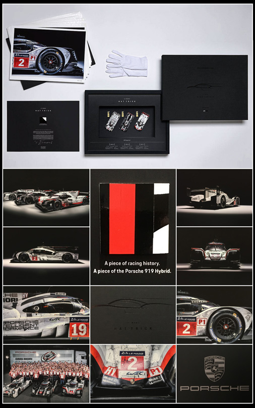 Coffret Porsche 919 Hattrick Le Mans 3 miniatures 1/43 des 919 vainqueur 24h du Mans 2015 / 2016 / 2017 8 impressions artistiques de qualité numérotées individuellement 1 paire de gants en coton pour manipuler les objets Certificat d'authenticité unique identifié par un véritable morceau de 919 Edition Limitée individuellement numérotée Porsche Design WAP0929190J