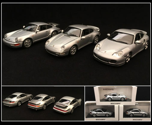 Trio 964 / 993 / 996 Turbo - Année 1990, 1997 et 1999 Gris polaire métallisé 1/43 - Minichamps 943069103 + 943069203 + 943069303