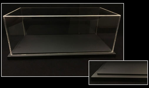 Boite Vitrine pour miniature 1 : 18 33.8 x 17 x 13.3 cm La partie supérieure de la vitrine est d'une qualité Acrylique élevé La partie inférieure est en bois noir très solide et de bonne qualité. Miniature vendue séparement 29,95 € TTC / Incl. Taxes