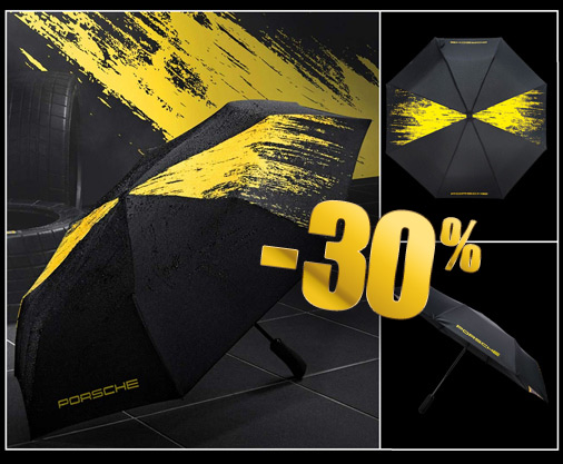 Parapluie de portière Porsche GT4 Clubsport Mécanisme d'ouverture automatique - Système coupe-vent Diamètre ouvert 95 cm - Matière 100% Polyester pongée Mat aluminium / fibre de verre - Couleur noir / jaune Porsche WAP3400040LCLS