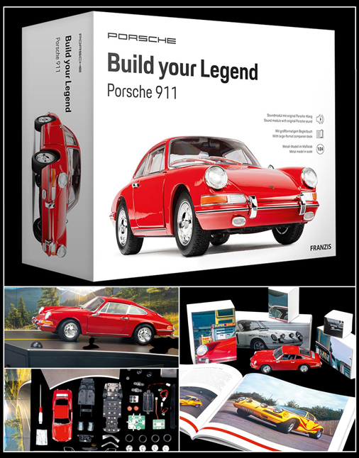 Kit à monter - Porsche 911 1965 16 étapes pour la construction - Kit en métal, assemblage possible sans colle Socle avec éclairage LED & module sonore intégré : Son original d'un moteur Porsche Livret d'accompagnement avec instructions de montage en Anglais / Allemand Miniature Porsche 911 1965 - Rouge Signal 1/24 Requiert 2 piles 1,5 V (AA) non-incluses Franzis 67247 129,95 € TTC / Incl. Taxes