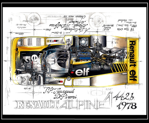 Poster Renault Alpine A442B - Vainqueur 24h Le Mans 1978 Reproduction de peintures originales de Sebastien Sauvadet 30 x 40 cm - Papier 200 g/m2 Edition Limitée - 200 exemplaires numérotés 29,95 € TTC / Incl. Taxes
