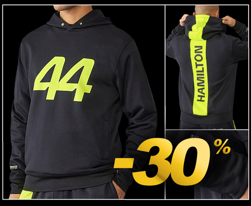 Hoodie mixte Lewis Hamilton Mercedes-AMG F1 Matière 75% Polyester / 25% Coton - Couleur Noir / Jaune Capuche réglable doublée en jersey - 2 poches latérales Mercedes 701227116-001