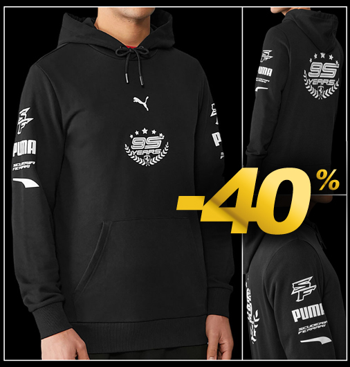 Hoodie homme Scuderia Ferrari 95 Ans Matière 70% Coton / 30% Polyester - Couleur Noir Capuche réglable - Poche kangourou Ferrari 701228026-001