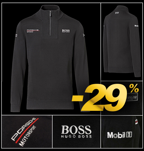 Pull Mixte Porsche Motorsport BOSS - Tailles XS / XL / XXL seulement Col montant avec fermeture éclair - tirette marquée Porsche - Couleur Noir Matière 100 % Coton / Col et bords 8% Polyamide - Maille légère et bords côtes Logos brodés Porsche et Hugo Boss sur poitrine et cou Logos brodés Mobil1 et Michelin sur manches Porsche WAP121MMSR