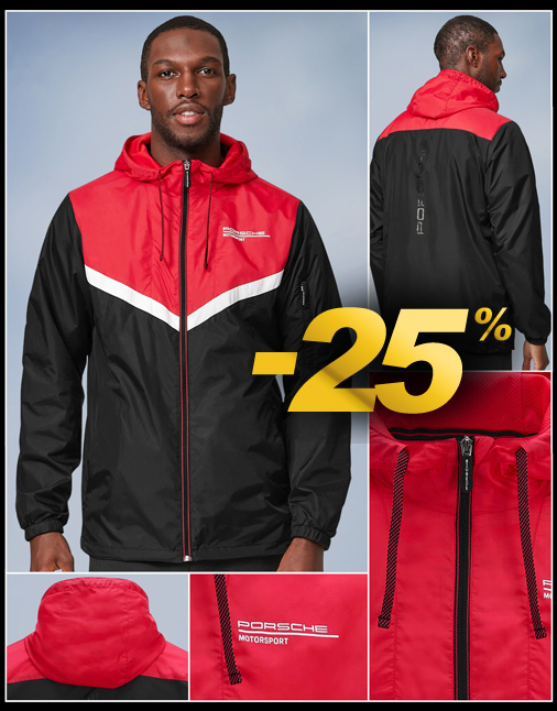 Veste à capuche homme Porsche Motorsport Coupe vent et imperméable / effet déperlant - Matière 100% Polyester Capuche et possibilité de resserrer la veste au niveau de la ceinture 2 grandes poches latérales zippées - Couleur Noir / Rouge Fermeture par zip - Porsche WAP123NFMS