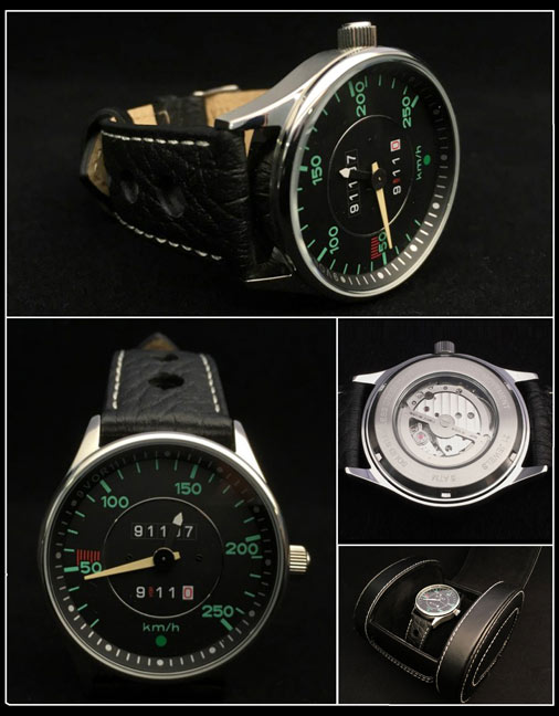 Montre Automatique - Compteur de vitesse Porsche 911 - 250 km/h Mouvement mécanique automatique Miyota Japan Calibre 821A fréquence 21600 a/h, 21 rubis Bracelet perforé en cuir noir / surpiqué blanc Boitier en acier inoxydable chrome Etanche 5 ATM / 50 m Diamètre 41 mm - Epaisseur 12.8 mm Made in Germany
