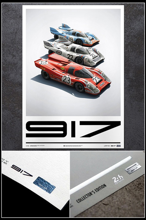 Affiche Porsche 917 K Trio - 24h le Mans 1970 / 1971 Affiche originale 175g/m2 - Format 50 x 70 cm Cadre non fourni - Série limitée - 917 exemplaires 119,95 € TTC / Incl. Taxes