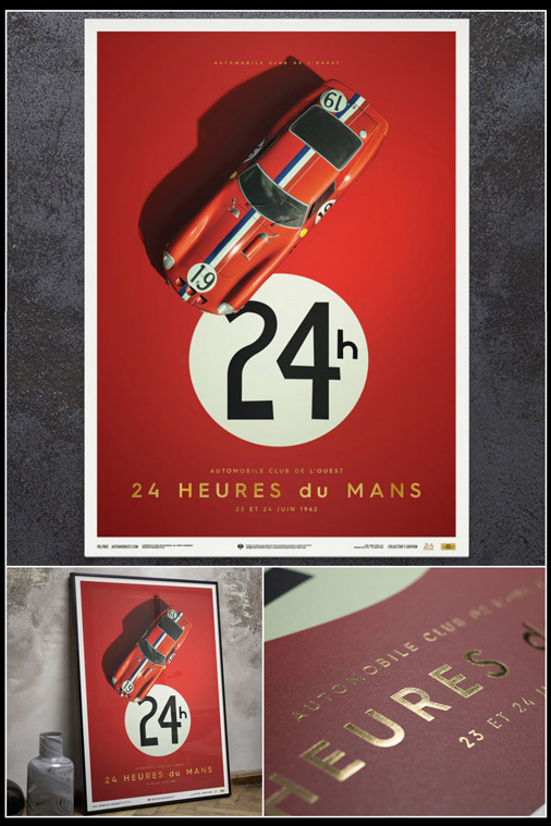 Affiche Ferrari 250 GTO n°19 - 24h le Mans 1962 Affiche originale 175g/m2 - Format 50 x 70 cm Cadre non fourni - Série limitée - 1000 exemplaires 119,95 € TTC / Incl. Taxes