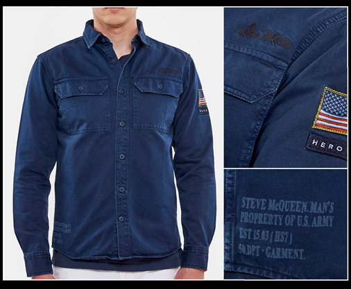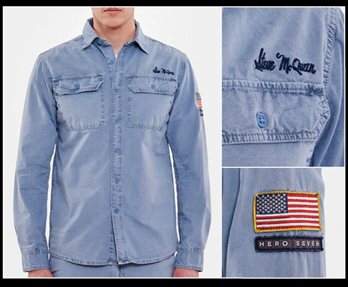 Chemise homme Steve McQueen US army Monogramme Steve McQueen sur le devant - Drapeau US brodé sur la manche Deux poches poitrine boutonnées - Matière 100 % toile de coton Couleur Gris bleu 99,95 € TTC / Incl. Taxes