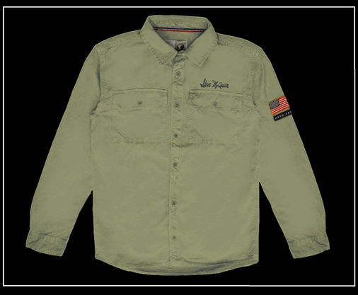 Chemise homme Steve McQueen US army Monogramme Steve McQueen sur le devant - Drapeau US brodé sur la manche Deux poches poitrine boutonnées - Matière 100 % toile de coton Couleur Vert Kaki 99,95 € TTC / Incl. Taxes