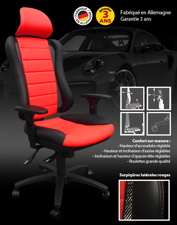 Fauteuil de Bureau Headpoint RS Sport - Rouge indien / Noir Réglage synchrone de l'inclinaison de l'assise et du dossier - système de fixation en continu Conçu pour une durée d'assise très longue Avec appuie-tête et accoudoirs réglables Dossier en résille et rembourré pour un soutien optimal du dos Assise galbée réglable en hauteur - Revêtements simili cuir Piétement étoile avec 5 roulettes doubles Poids : 19kg - LxHxP : 50 x 121/150 x 48 cm Made in Germany - Garantie 3 ans