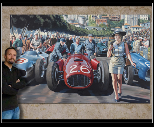 Reproduction d'une peinture originale de Benjamin Freudenthal Alberto Ascari, Monaco GP 1955 240 x 150 cm - Bâche PVC cirée - 8 oeilletons pour l'accrochage Résistante à l'eau - Vernie anti-UV - Lavable 599,95 € TTC / Incl. Taxes