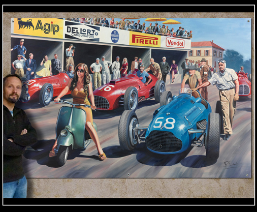 Reproduction d'une peinture originale de Benjamin Freudenthal Gina Lollobrigida, Monza GP 1950 225 x 150 cm - Bâche PVC cirée - 8 oeilletons pour l'accrochage Résistante à l'eau - Vernie anti-UV - Lavable 599,95 € TTC / Incl. Taxes