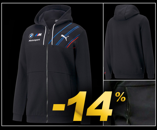 Hoodie homme BMW Motorsport by Puma 2 poches latérales zippées - Capuche réglable par cordon Couleur : Gris Anthracite - Matière : 67% coton / 33% polyester BMW 701219208-001