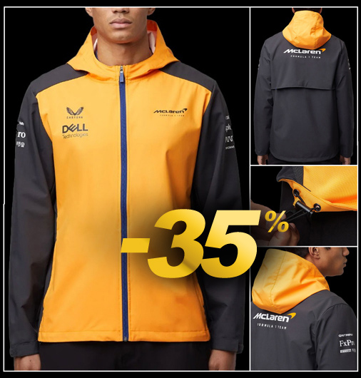 Veste homme McLaren F1 Fermeture principale par zip étanche - Matière 100% polyester - Taille et manches réglables Capuche composée en 3 parties - 2 poches latérales zippées Couleur Orange Papaya / Gris Anthracite McLaren F1 Team TM0826