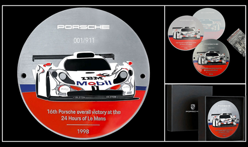 Badge de Grille Porsche 911 GT1 Vainqueur 24h Le Mans 1998 Diamètre 9,5 cm - Matière 95% Zinc / 5% Acrylique Autocollant et vignette inclus pour intérieur et extérieur Kit de fixation sur le véhicule inclus - Fabriqué en Allemagne Porsche WAP0508120RGBD Edition limitée - 911 exemplaires 99,95 € TTC / Incl. Taxes